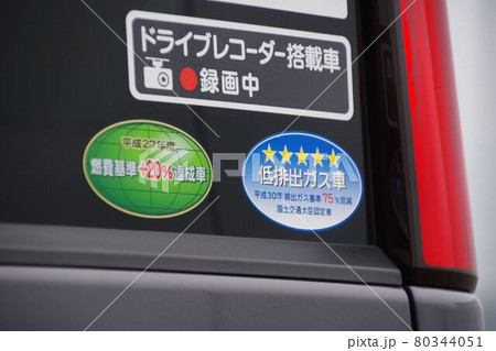 リアガラスのステッカー 燃費基準達成車 低排出ガス車 ドライブレコーダー録画中