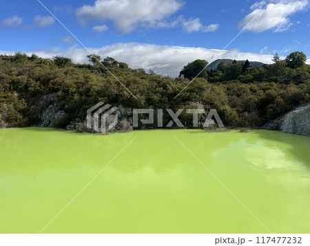 Geothermal landscape with green sulphur lake, Rotorua, New Zealand