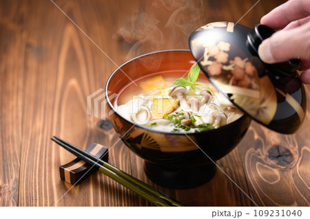 会津漆器に入れた豪華な具沢山なしめじと豆腐とかぼちゃの味噌汁