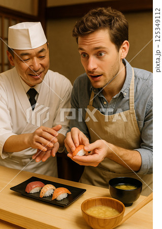 巻き寿司作りを体験する外国人観光客と寿司職人