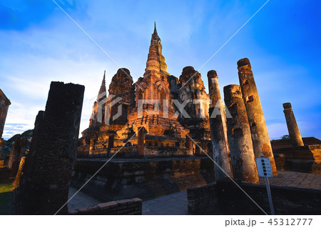 Sunset at Wat Mahathat buddha and temple in Sukhothai Historical Park