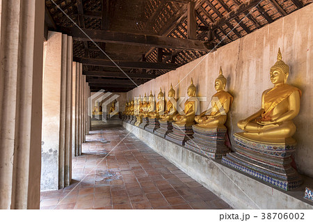 Perspective image of Buddha statue at cloisterse area in the Phutthaisawan Temple.