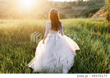 花畑にたたずむ純白ドレスの花嫁の後ろ姿