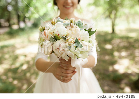 結婚式場でブーケを持つ花嫁・新婦の女性