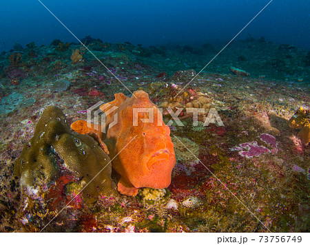 小さな珊瑚に寄りそうオオモンカエルアンコウ (シミラン諸島、タイ王国)