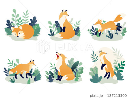 Set of Cute Fox in Forest Scene, Flat Animal Cartoon Design