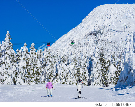 樹氷原の緩斜面から三宝荒神山を望む (山形県、蔵王温泉スキー場、樹氷原コース)