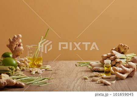 Ginger, lemongrass and lemons are decorated on a wooden table. Glass jars of essential oil extracted from these herbals, benefits for health, skin and hair. Blank space for product presentation