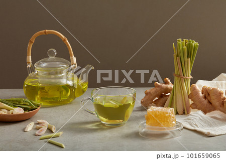 Glass teapot and cup containing lemongrass and ginger tea, decorated with a beeswax over a minimalist background. Enhance health, skin and hair condition