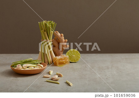 A ginger, a lemon slice and many lemongrass are displayed on minimalist background with a beeswax. Blank space to add text or promote product. Herbals can improve hair and skin condition