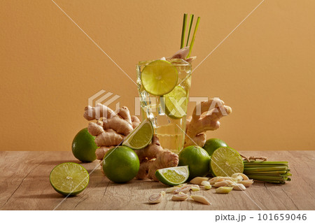 A glass filled with lemonade mixed lemongrass and ginger, combination for healthcare, skincare, helps losing weight, sleep well and reduce stress