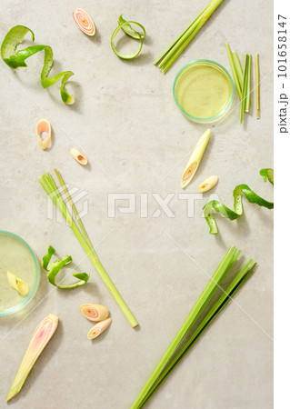 Few petri dishes of essential oil extracted from lemongrass decorated with lemon peels and lemongrass on a light background. Blank space for product presentation. Healthy lifestyle concepts