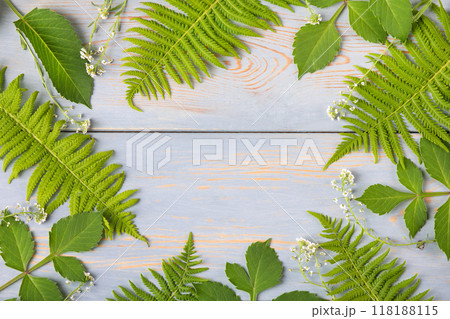 Green leaves fern and dahlias on blue wooden background. Creative layout made of leaves with place for your text . Flat lay. Nature concept