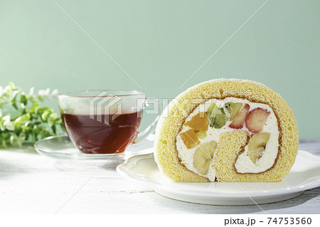 日本で人気のフルーツロールケーキ(イチゴ、キウイ、桃、バナナ、生クリーム)とオーガニック紅茶のセット