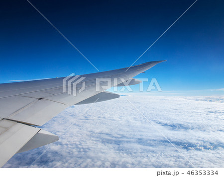View through airplane window of commercial jet plane wing flying high in the sky. Air travelling concept