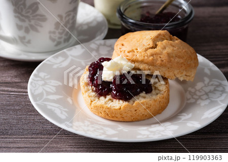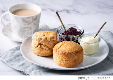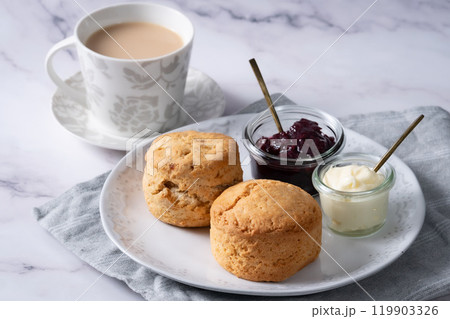 スコーンでクリームティー アフタヌーンティー ミルクティー ジャムのせ 大理石背景