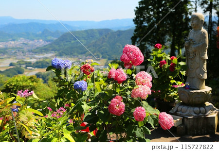 天引観音あじさい祭り青色のアジサイの花が咲く境内の風景
