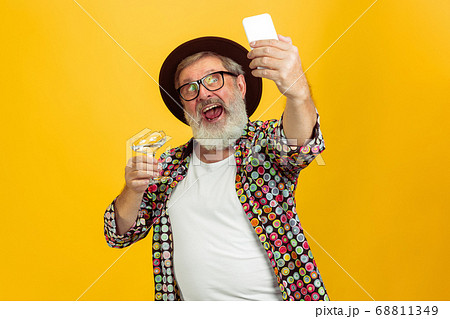 Senior hipster man wearing eyeglasses posing on yellow background. Tech and joyful elderly lifestyle concept