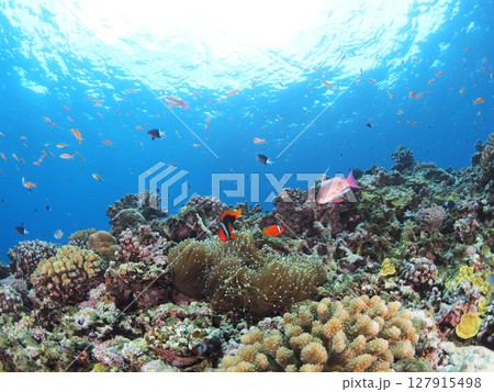 素晴らしいサンゴ礁の美しいイソギンチャクと可愛いハマクマノミ 美しいサンゴ礁と熱帯魚の群れ。 沖縄県
