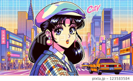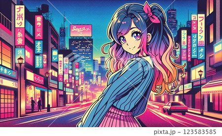 Anime girl poster in manga style. Tokyo Japan anime girl with concept of virtual reality,retro,futurism,futuristic,cyberpunk. Japanese y2k vector illustration. Kanji translation is Kawaii or Cute