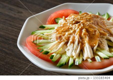 焼いた鶏肉と野菜のグリルチキンサラダに胡麻ドレッシングをかける