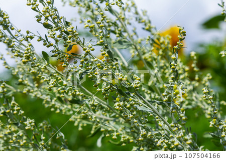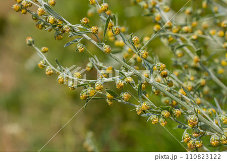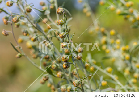 Wormwood green grey leaves with beautiful yellow flowers. Artemisia absinthium absinthium, absinthe wormwood flowering plant, closeup macro