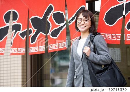 一人でラーメン店から出てくる笑顔の若い女性