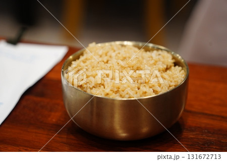 Bowl of freshly cooked brown rice on a wooden table