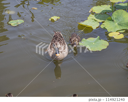 池で泳ぐカルガモの親子
