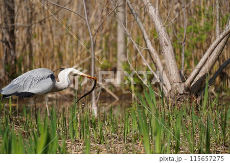 水辺で魚を食べるアオサギ