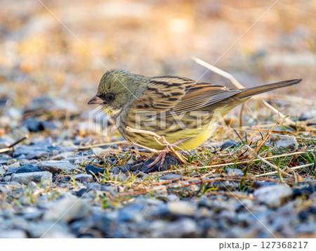 地面を歩くアオジ