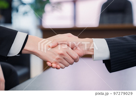 契約成立イメージ―契約書の上で握手を交わすビジネスマンのイラスト