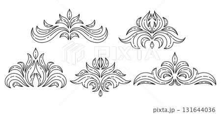 Decorative set of floral elements in baroque style. Engraved black curling plant.