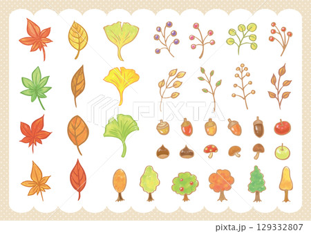 優しい色の秋の紅葉した葉っぱ・木・実などの水彩風手描きイラストセット