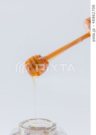ハニーは、白い背景の上に木製蜂蜜ディッパーから滴ります