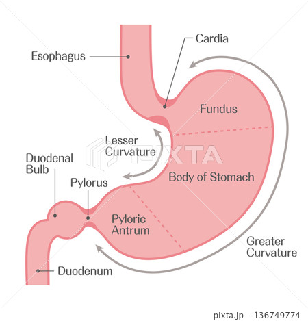 胃の構造解剖図(胃底部・胃体部・幽門)カラー