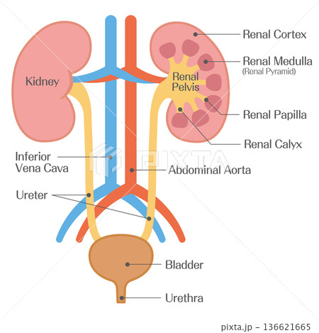 腎臓内部構造の解剖図(皮質・髄質・腎盂)