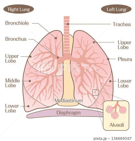 肺の構造解剖図(気管・気管支・肺胞)カラー