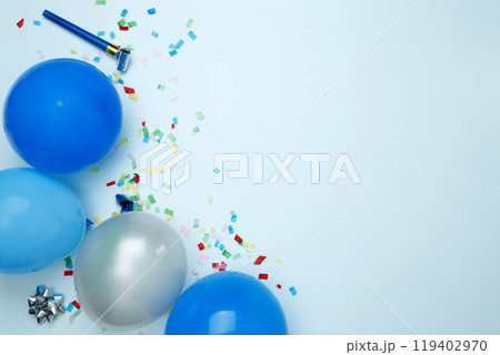Birthday attributes colorful balloons and confetti. Concept of festive birthday celebrations