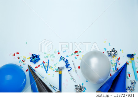 Birthday attributes colorful balloons, party hats and confetti. Concept of festive birthday celebrations