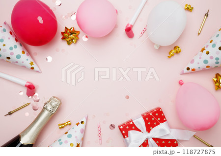 Concept of festive birthday celebrations. Blank card surrounded by colorful balloons, party hats, candles, confetti