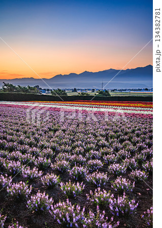 早朝のファーム富田 花畑と十勝岳連峰の朝焼け
