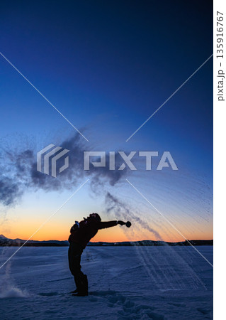 冬の浜辺に佇むジュエリーアイスと黄昏の空