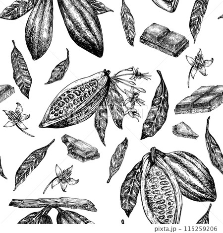 Seamless pattern with cocoa fruit and chocolate graphic illustration, hand drawn sketch of vegetable, leaves, flowers. Botanical drawing of tropical fruit. Engraving for food packaging design