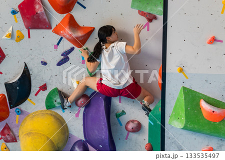 [ボルダリング] ボルダリングスタジオで女子小学生クライマーが難しい課題に挑戦するシーン
