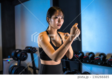ジムでボクササイズ運動するかっこいい女性 ファイティングポーズ