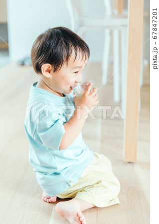 小さな男の子が床に座って笑顔で水を飲んでいる kids sit drink water