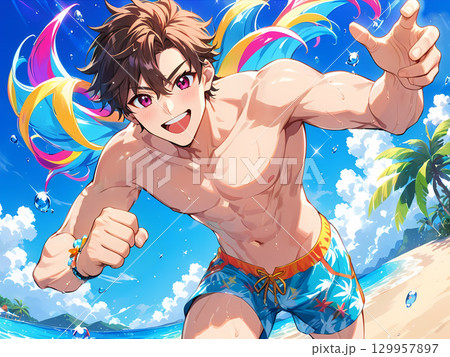 鮮やかなビーチ、勢い良さそうにこちらに向かってくる元気な海パンの男の子