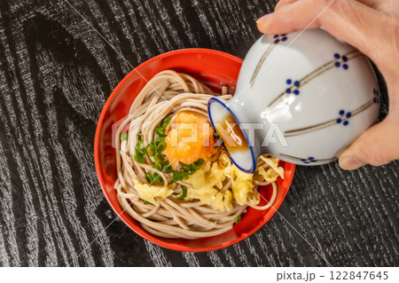 湯気は合成。かき揚げそば、蕎麦、年越しそば。お蕎麦、ソバ、めんつゆ、天ぷら、野菜と小エビのかき揚げ。