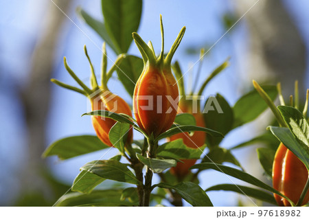 冬の日差しを浴びたクチナシの実のクローズアップ